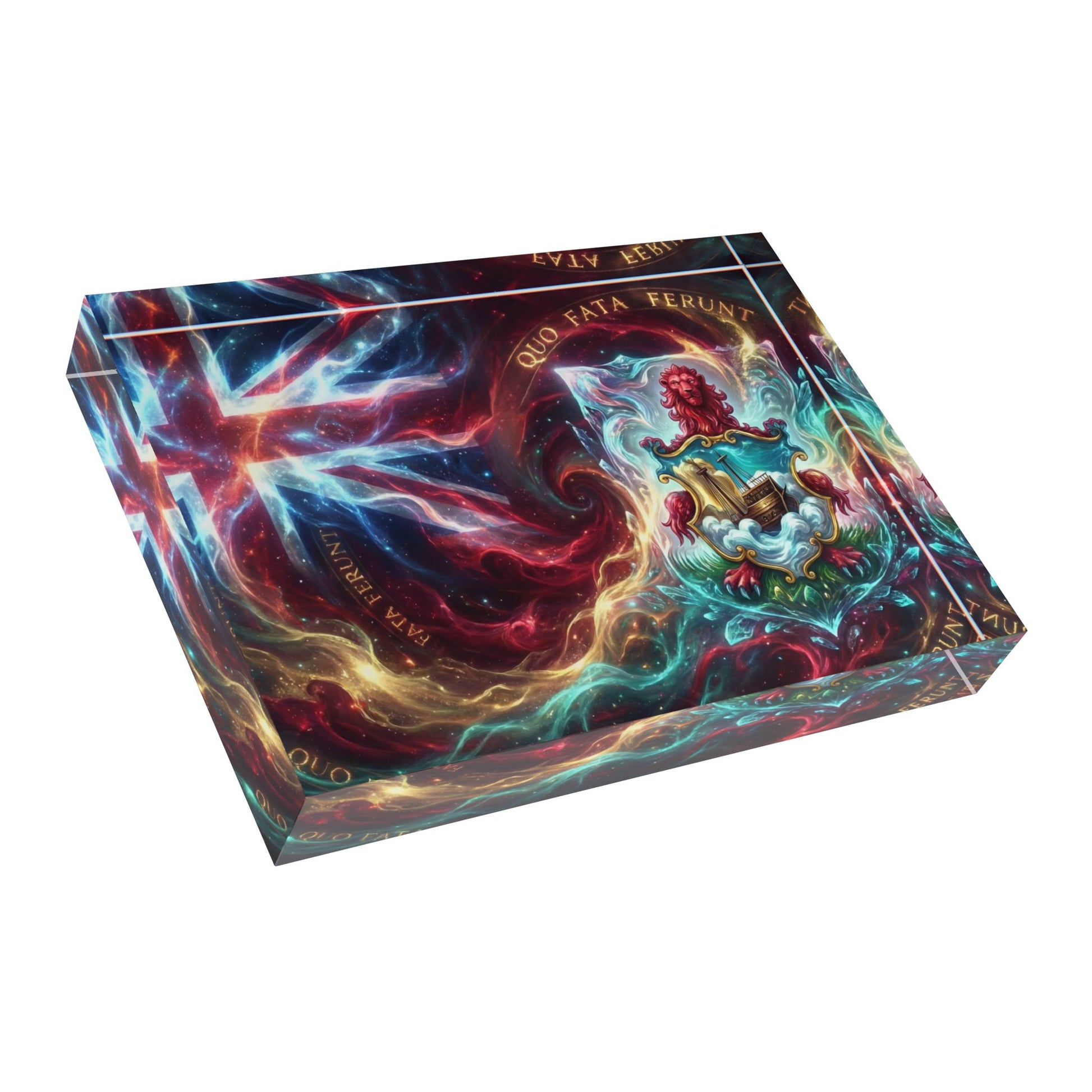 The piece pictured has a dramatic, painterly composition with intense color transitions and ornate crest-like elements; those elements gain dimensionality from the acrylic finish and vibrant print. Available in horizontal or vertical orientations, the block works with landscapes, portraits, and artistic prints alike. Easy to dust and built to last, it’s a tactile way to display memories or artwork while keeping a refined, contemporary look.