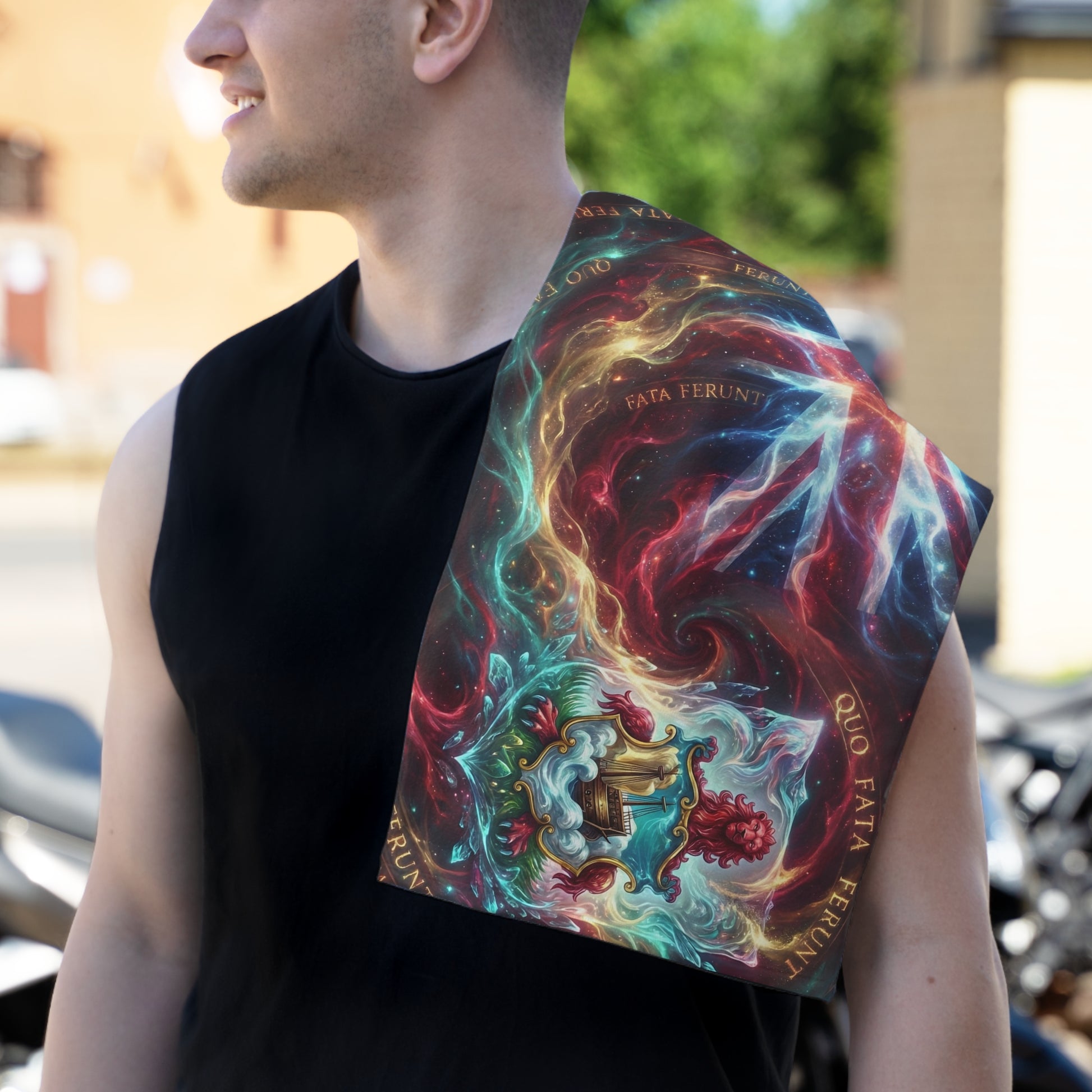 This rally towel carries thunder and pageantry in its fibers — a bold banner for those who wear their allegiance on game day or display it as a vivid keepsake. Electric streaks form a radiant cross above a heraldic crest, while swirling nebula-like colors and a Latin motto trace a path of tradition and fire. Lightweight and quick-drying on the printed face, the towel’s soft cotton loop backing makes it pleasant to hold, wave, or drape over a shoulder. It’s for people who want energy and history in one graphic — to lift in the stands, pin up in a dorm, or keep by the kit bag as a talisman of team spirit and legacy.