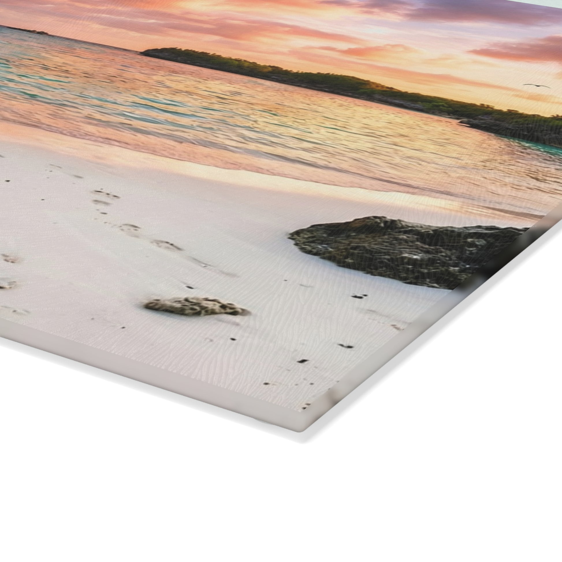 Bring a slice of tranquil shoreline into your kitchen with this tempered glass cutting board. The image of a pastel sunset spilling over turquoise water and soft sand feels like a quiet evening walk at the water’s edge. Use it as a prep surface that brightens your counter, or as a display piece when you want a moment of calm during a busy day. The textured glass and vivid printing keep the scene crisp, while rubber feet hold the board steady as you work. Hand-wash to preserve the print and enjoy a durable, sanitary surface that resists stains and odors unlike wood or plastic.